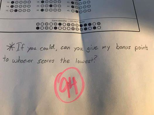 Trong bức ảnh đó, cậu học sinh để lại lời nhắn cho người chấm điểm như sau: " Nếu có thể, hãy chuyển 5 điểm trong bài kiểm tra của con sang cho bạn nào có số điểm thấp nhất trong kỳ thi này ".